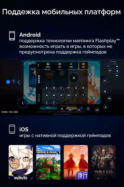 - возможность играть на мобильных устройствах андроид в игры без поддержки геймпадов (PUBG, Fortnite), а также настраивать управление и макросы в мобильных играх на любой вкус с помощью приложения Flydigi Game Center;